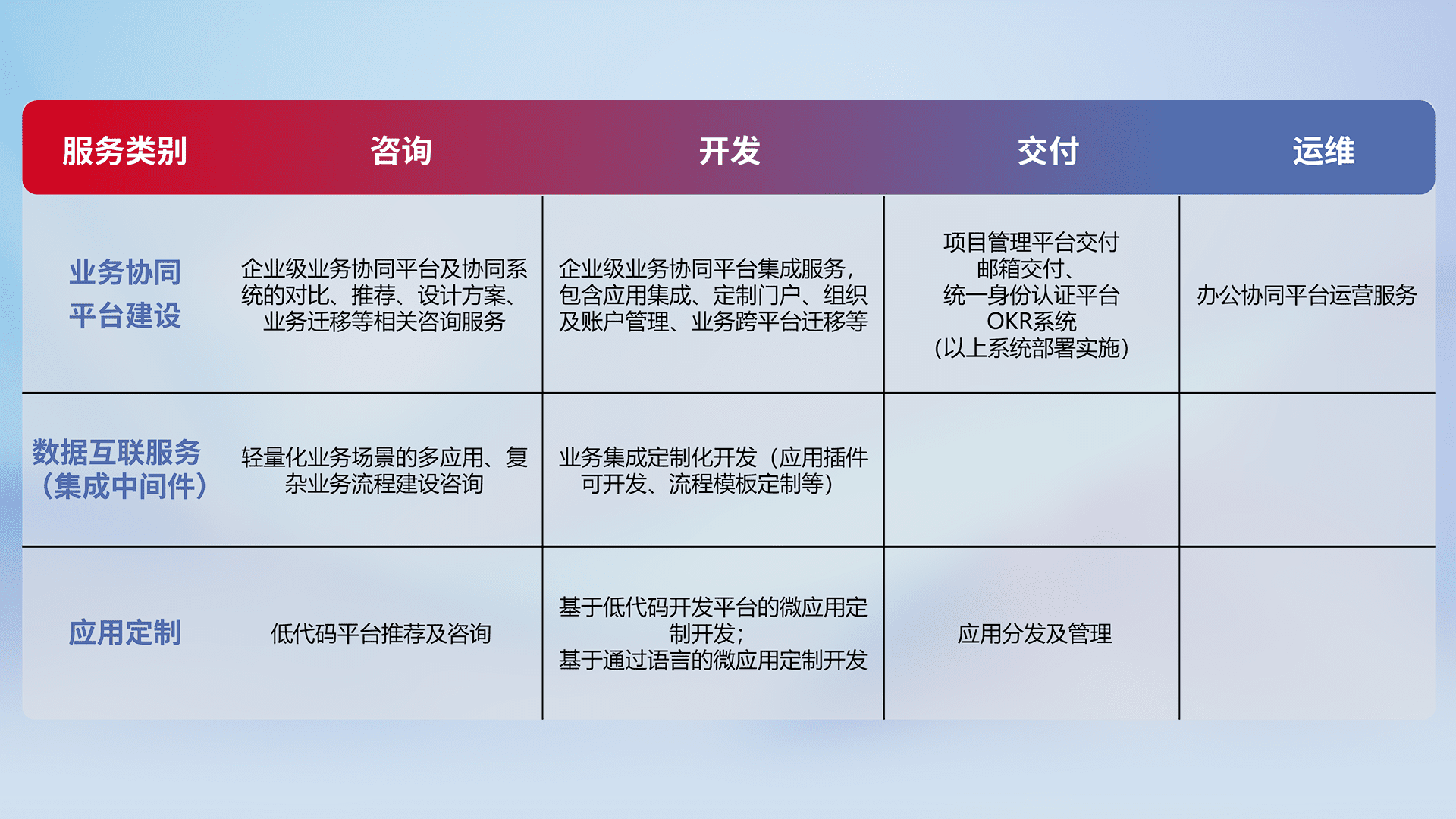 针对钉钉、、、企微、、、IDaas等平台级产品提供产品的规划、、方案、、、交付、、、、定制化开发等服务,,实现如统一协同办公、、、智能客户服务、、、、混合会议管理、、、智能数据查询、、、、等业务场景,,,,实现数字化转型。。